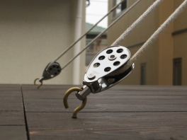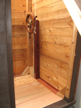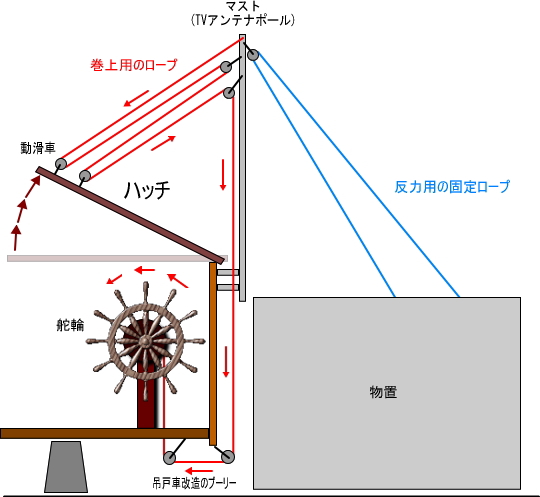 重いハッチを軽々と開閉するために,帆船らしい装置を考案しました。