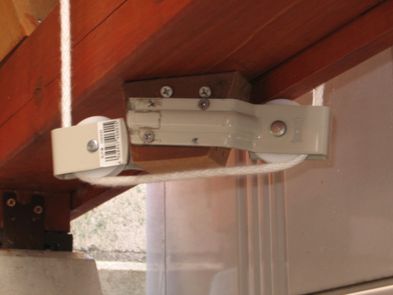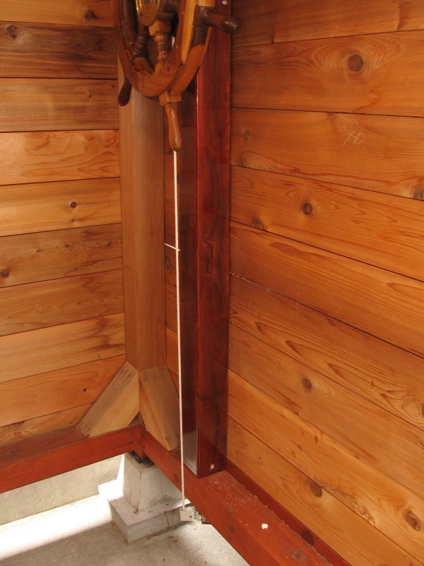 船内の舵輪を廻すと,巻上用のロープが引かれ,滑車に力が伝達されてハッチが開きます。