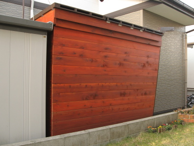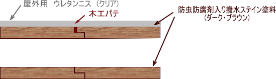 @塗料は,防虫防腐剤が添加されたステイン系のうち,撥水性のものを使用。