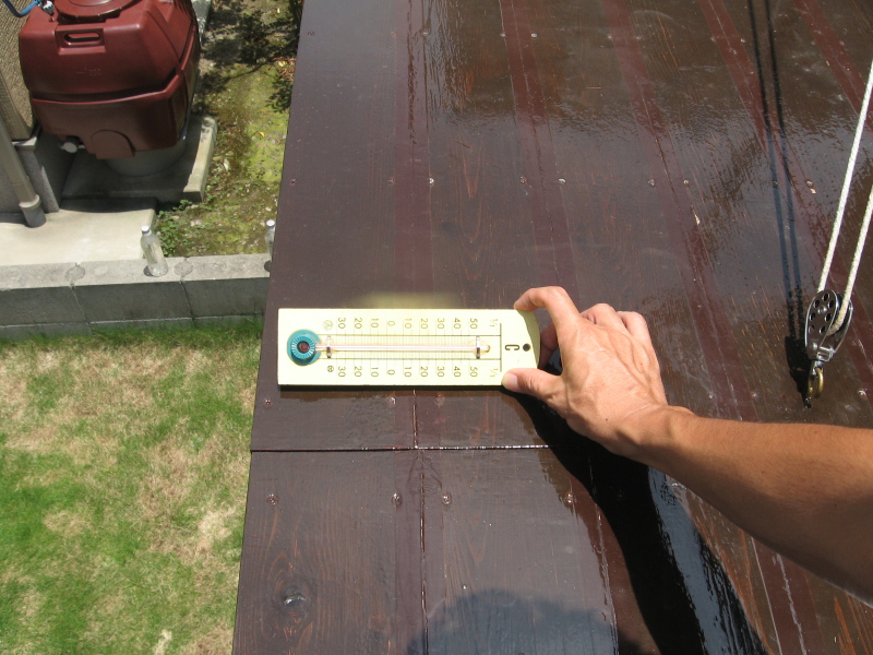 | 表面温度は50℃を軽く振り切れて,計測不能 | 甲板の中空内部は,47℃ | 船内の天井表面は,36℃ |