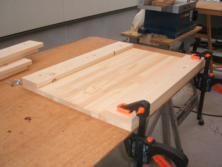 | パインの規格板(450mm×600mm)に,SPFの1×4を補強材として打ち付け,側板とします。 | 規格寸法で高さが不足する場合は,端材を下に打って,ゲタを履かせます。 材料費を抑えるコツは,なるべく規格材を活用することですネ |