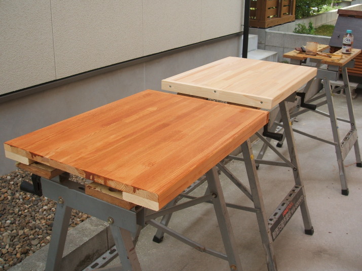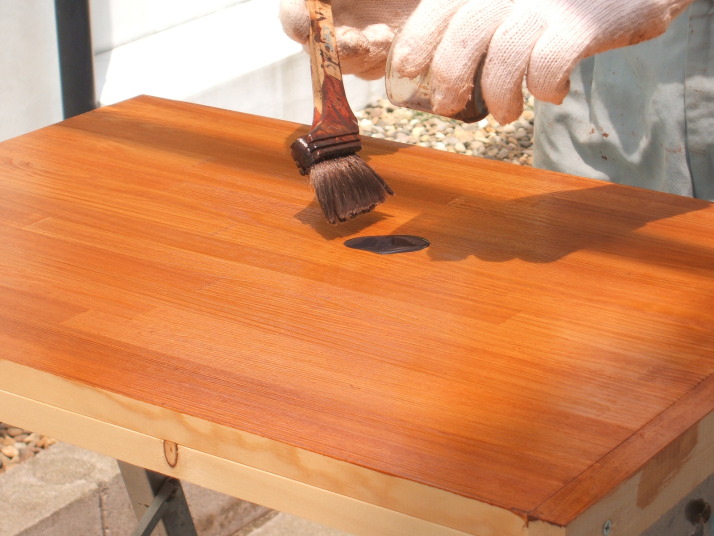| 側板を着色ニス塗装します。 | ドロッとしたニスをハケで塗るときは,ビンから直接,塗面に垂らして,すばやく「配る」ように塗ると,OK。 |