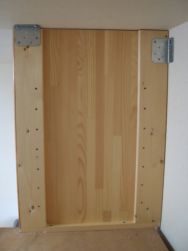 | 側板を天井・壁・家具に3辺固定。 これで,家具と家が一体化され,上にも横にも動く余地が無くなります。 |