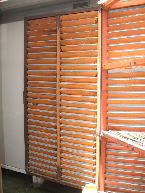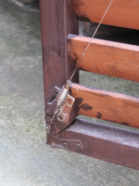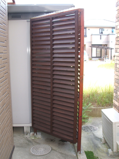 | 太陽の光がサンサン | ルーバーフェンス単体では扉としての強度が不足するため,斜めにワイヤーを張って補強しているところがミソ。 |