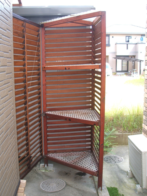 外のポリバケツに入れると生ゴミの汁が蒸れて臭いし,第一,ポリバケツ自体がカッコ悪い。そこで,場所をとらない屋外ストッカーを自作しました。