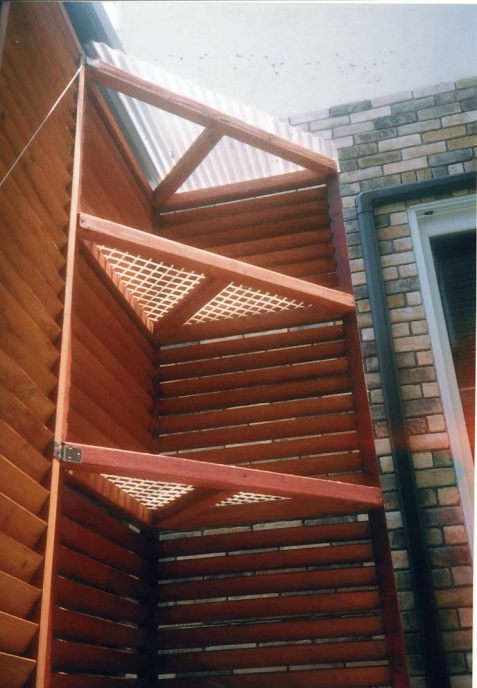 | 扉は,市販のルーバーフェンス(1.8m*0.9m)をそのまま流用しています。 | 三角柱の部分は,自作です。 |