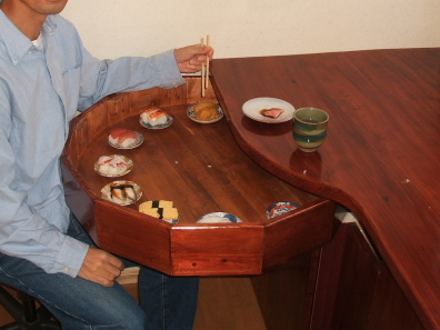 回転引出の中仕切は簡単に取り外せるので,いろんな使い方があります。まずは一人回転寿司。