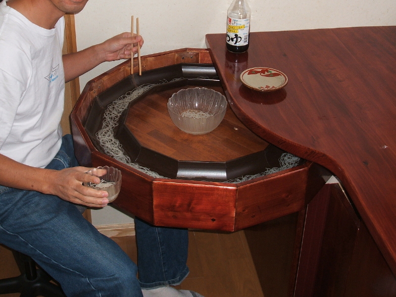 | 「二人そうめん流し」は,基本的に,一人が廻している間にもう一人が食べる,というスタイルをとりますので,仲のいいカップル以外のご使用はおススメできません。 | トホホな回転シーンは動画でもお楽しみください。 |