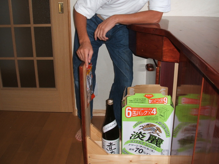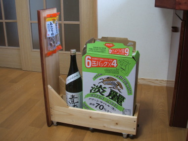 ビール箱の幅ピッタリに設計して,ビール,焼酎,おつまみをワンセットにまとめたところがミソ。