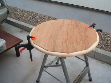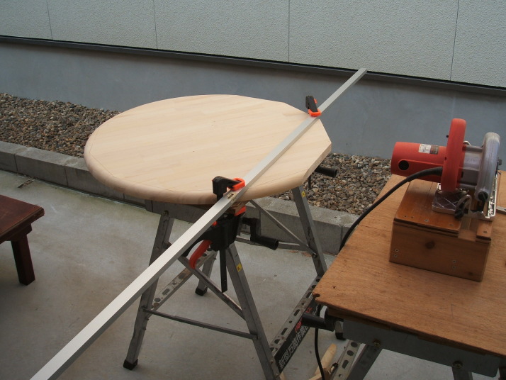 | ベニヤ板に,正12角形を正確に作図し,市販の丸テーブル用集成材に写し取りました。 | これを丸ノコで正確にカット |