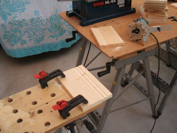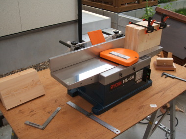 | この作業では手押しカンナが威力を発揮。 | 12枚の外縁板を,正確な加工精度で切り出すのに時間をかけました。 上はトリマーでホゾ加工しているところです。 |
