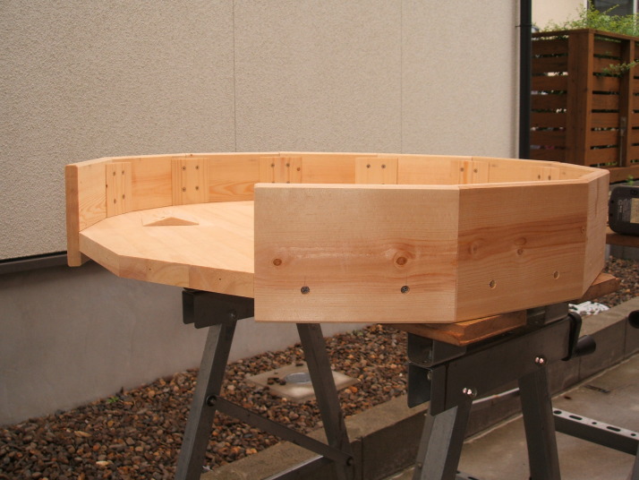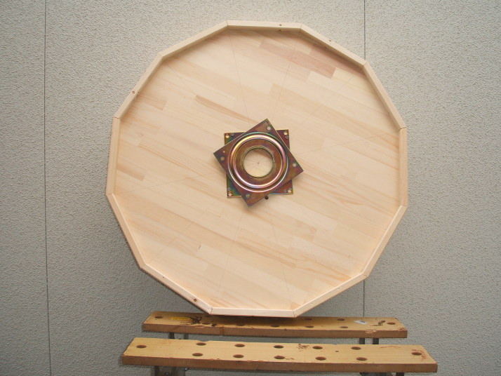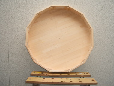 | 外縁板がリングとして一体化すると,ガチガチの強度が出ました。寿司桶みたい。 | 底にはベアリング回転盤をセット。 |