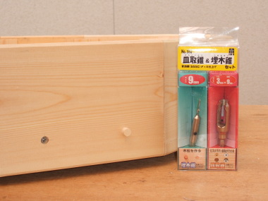 | 無粋なコーススレッドの頭は,埋木栓で隠します。 「皿取錐」で空けた穴にコーススレッドを打ち込み,右の「埋木錐」でクリだした栓で,埋めます。 |