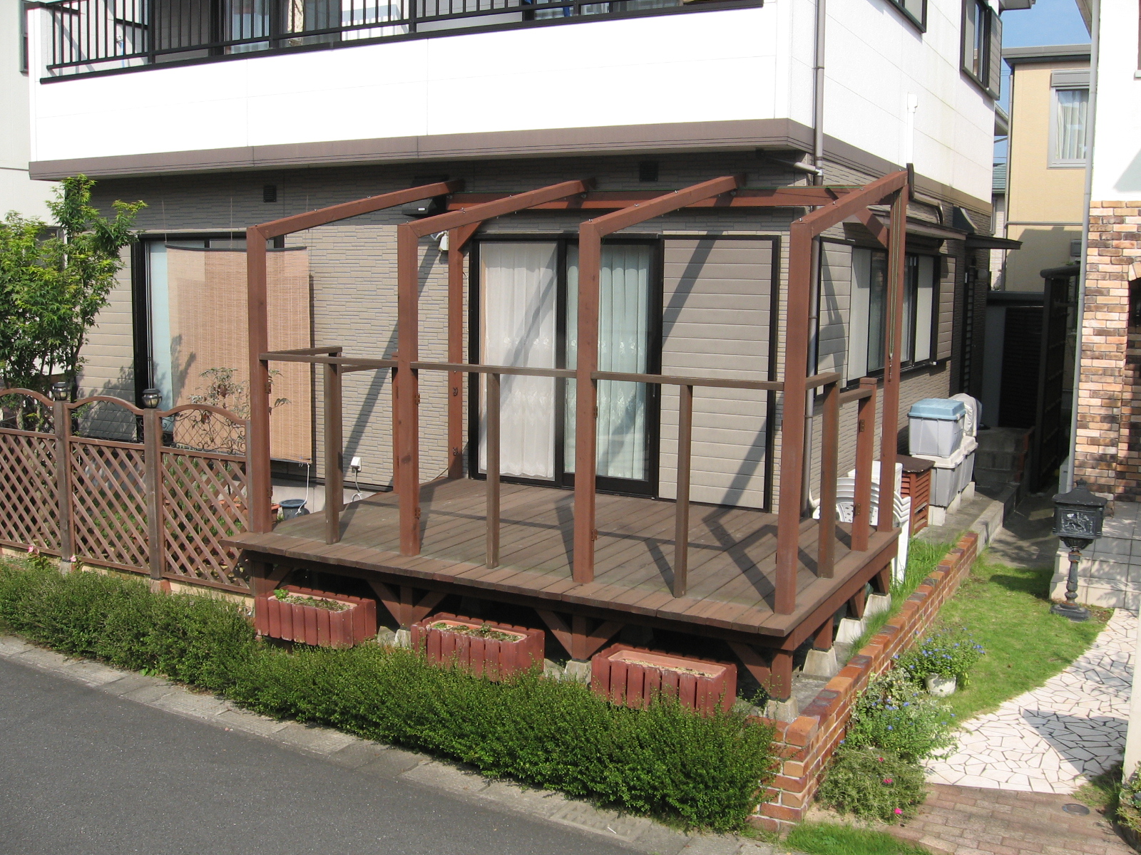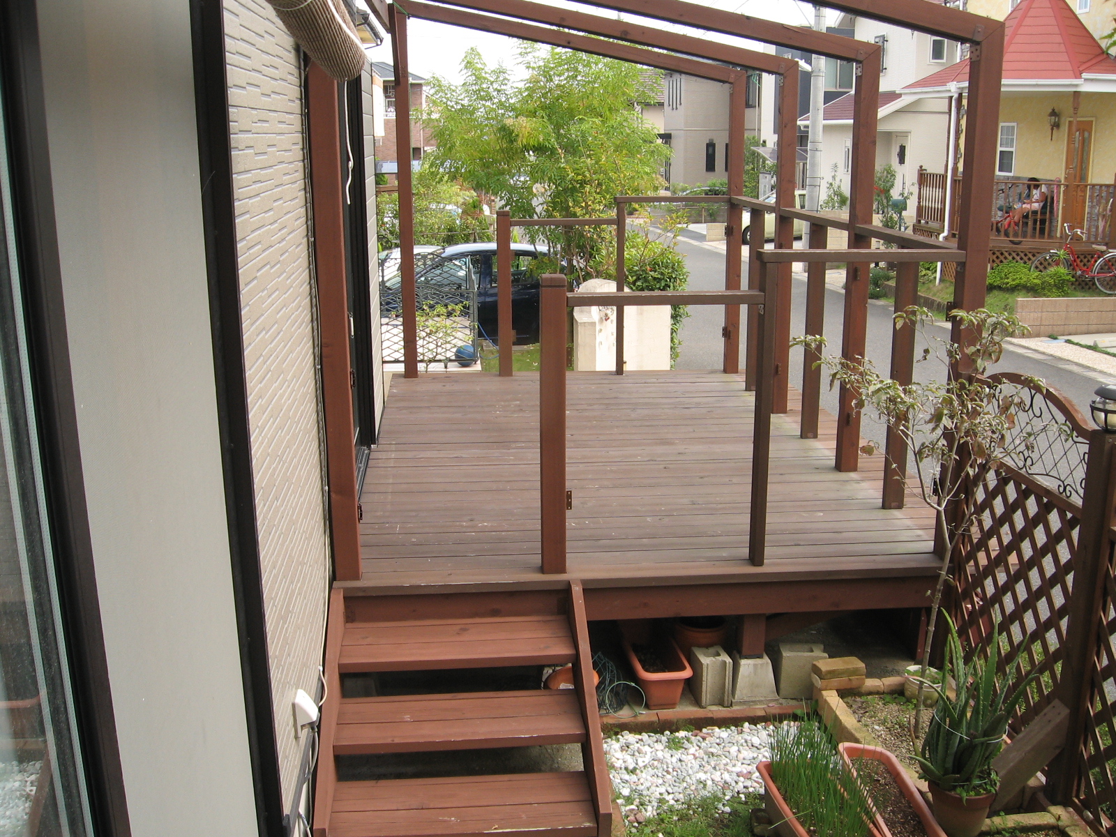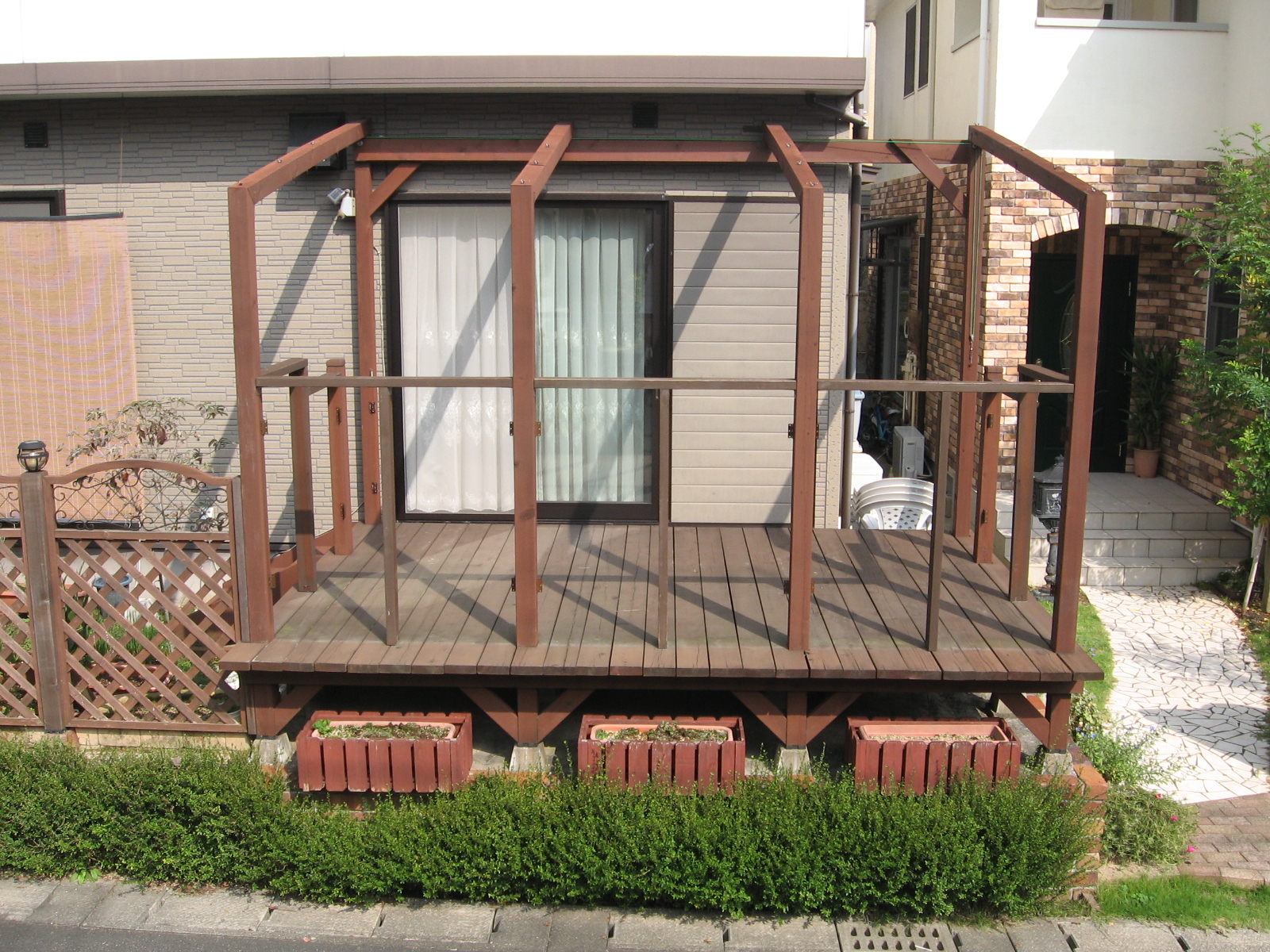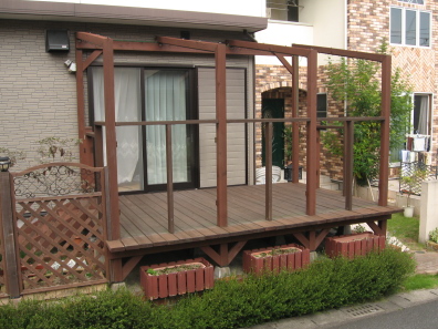ルーバーフェンスを取り付ける前の,素のウッドデッキをご覧ください。