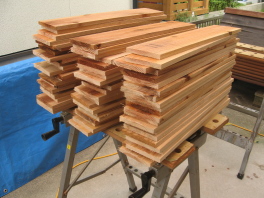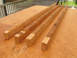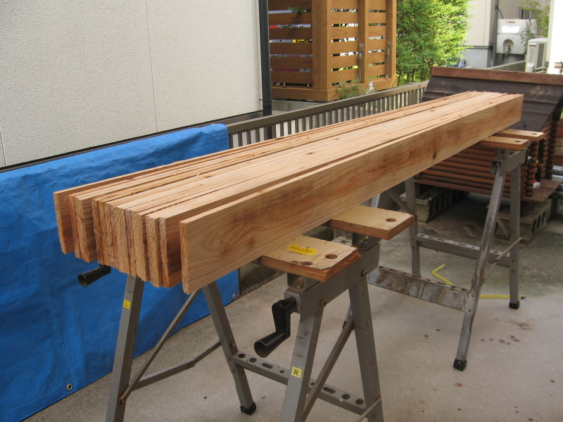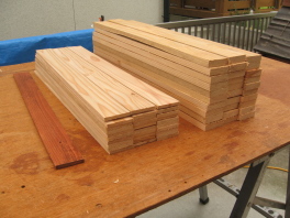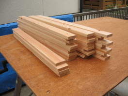 | 安い杉の荒材を束で買ってきて, | 節の部分を避けて切り出しました。 | 羽根の総数は334枚。 |