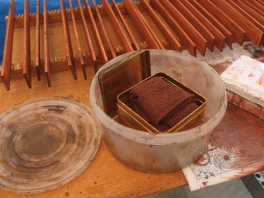 | 均一に塗れます。 | 使った後の「ぞうきん」は蓋つきの缶に入れ, | 漬物の容器に入れて密封保管すれば,1週間後も,すぐ使えます。 |