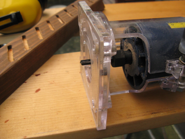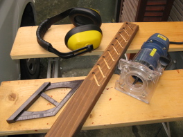 | 左端は45度のスコヤ(*1)。左上はイヤーマフ(*2)。 | 直径5.5mmのビットの先端がプレート面から5mm出る程度にセットし, | トリマーを静かに下し,定規に合わせて,じわっと手前に引くと,きれいな溝が彫れます。 |