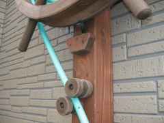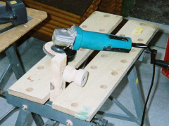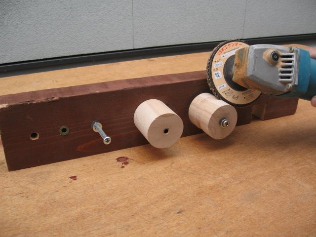 | 円盤を支え回転ブレを抑えるローラー(上)と,ホースを安定して繰り出すための木製ホースガイド(下) | 仮のロクロを仕立て,木工サンダーを当てると,うまい具合に削れてくれます。(再現シーン) | 実際の削り出し作業中(2004年12月) |