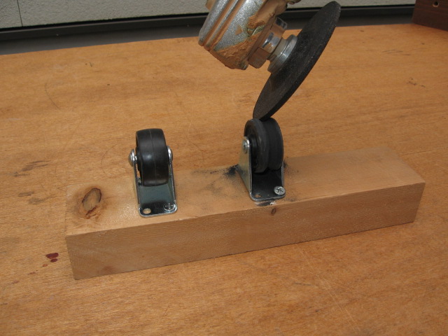 | ゴム製のキャスターに,回転するディスクサンダーを当てると,凹形になります。(再現シーン) |