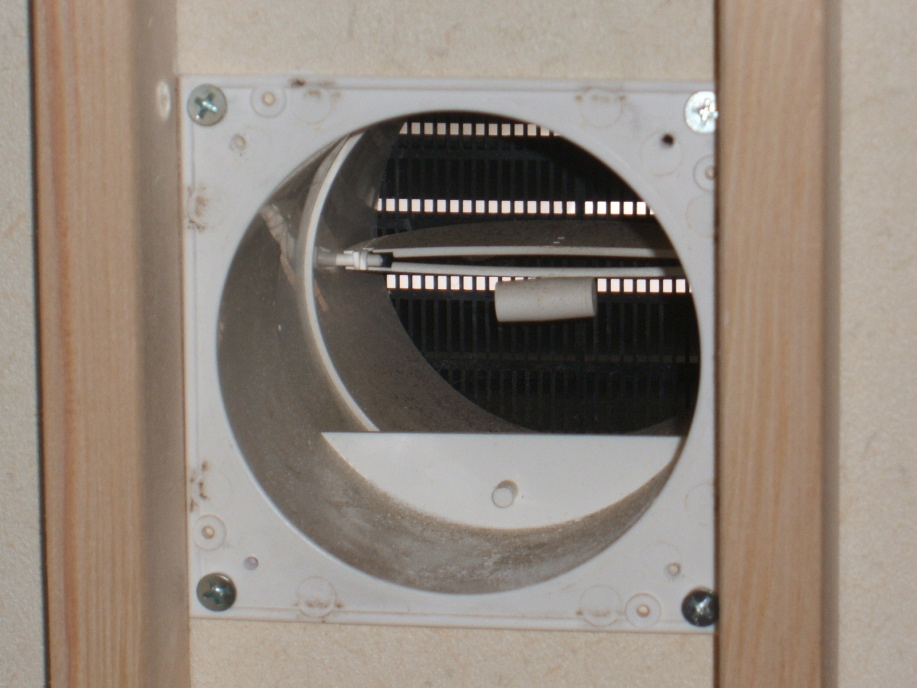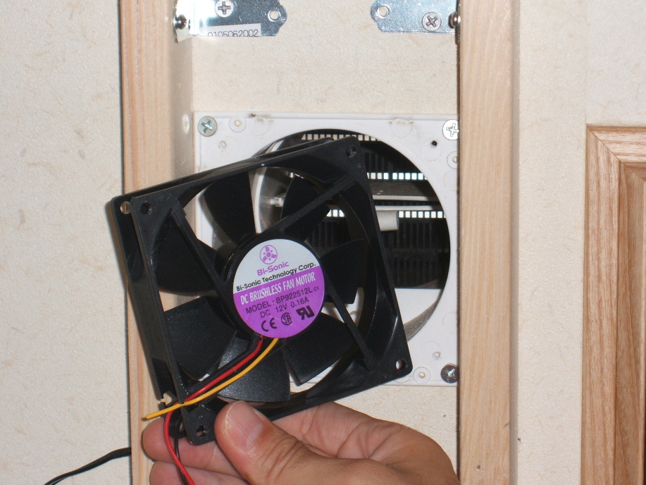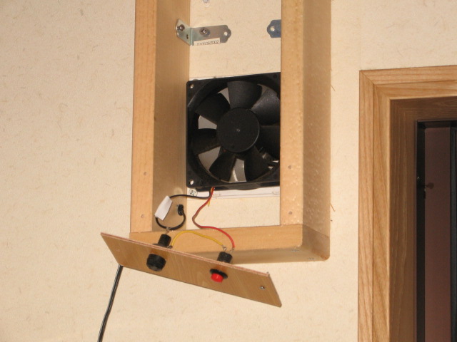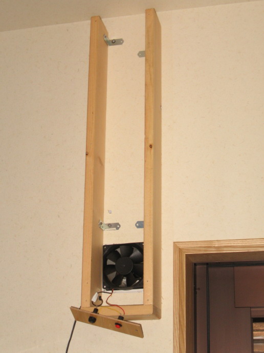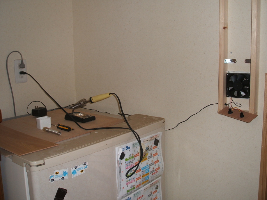 家の壁に穴を開ける訳にはいかないので,既設の24時間換気孔(直径80mm)と薄型の冷却ファンを利用したところがミソ。
