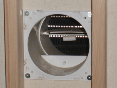 | 24時間換気システムの外気取り入れ口シャッター羽を抜くと,径80mmの穴が出現します。 | これがパソコン用の冷却ファン。直流12ボルト,0.2アンペアで駆動します。1個1650円と安いパーツですが,風量は十分。詳しくは(株)ミヨシへどうぞ |